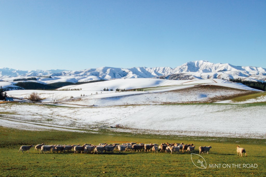 卡车开进Mackenzie Country区,眼前出现一片白茫茫的雪山美景,我惊呼「好美!!!」立刻就拿出手机开始拍照。