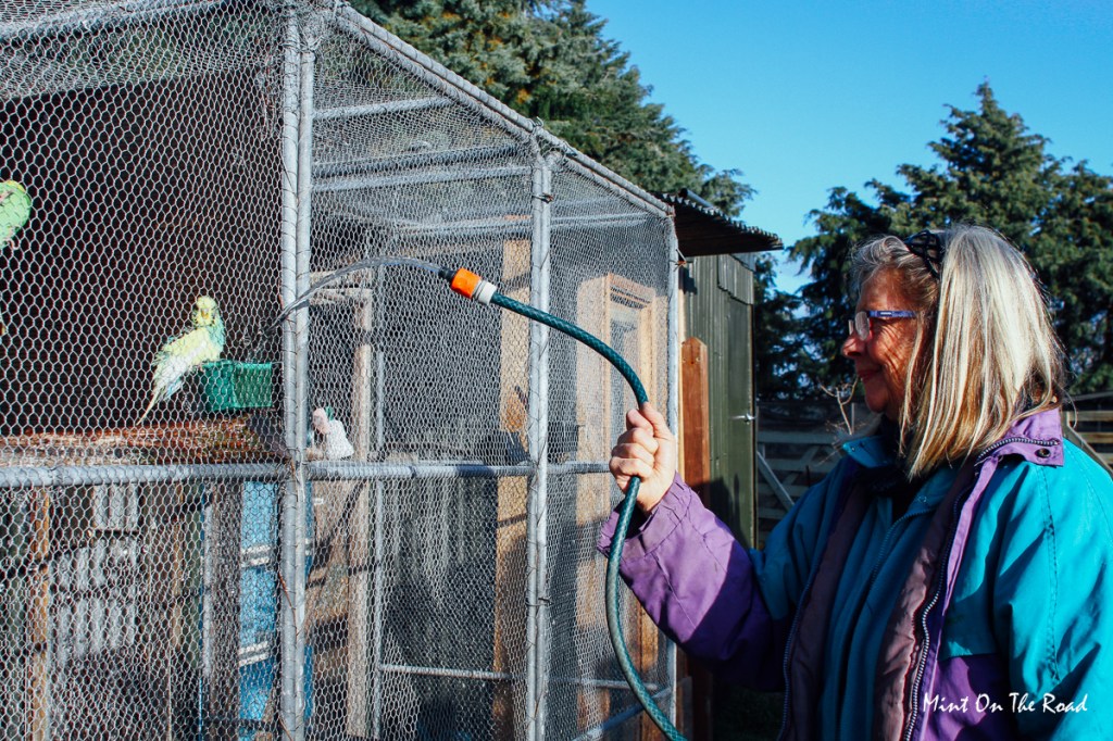 Dudley和Lynda是一对很恩爱的老夫妇,家在南岛北部的Blenheim。有一次问起他们有没有孩子,Dudley说他们2年前才在一起的,他有5个孩子,Lynda有3个孩子,孩子全比我大。不跟孩子住,不含饴弄孙,他们选择过二人世界,养了2只狗、2只绵羊、3只猫、3匹马和40只Budgies和Cockatiels(鹦鹉),生活非常充实。