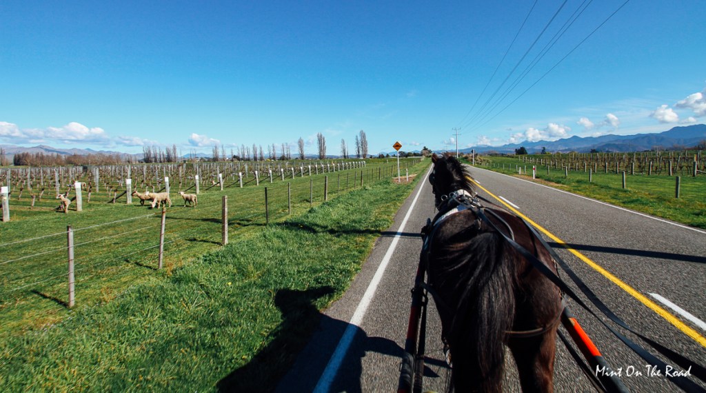 帮马梳理好毛发,清理好卡在马蹄铁里的泥巴,把马车系好,我们终于可以出发啦~Blenheim是纽西兰阳光最充足的城镇,是葡萄培植与制酒重地,是背包客的打工天堂。我原本也以为我会是为了工作而到来,但一直没找到Blenheim的工作,有点可惜,但没想到老天爷另有安排,让我以更特别的方式—坐在马车上欣赏Blenheim的美。