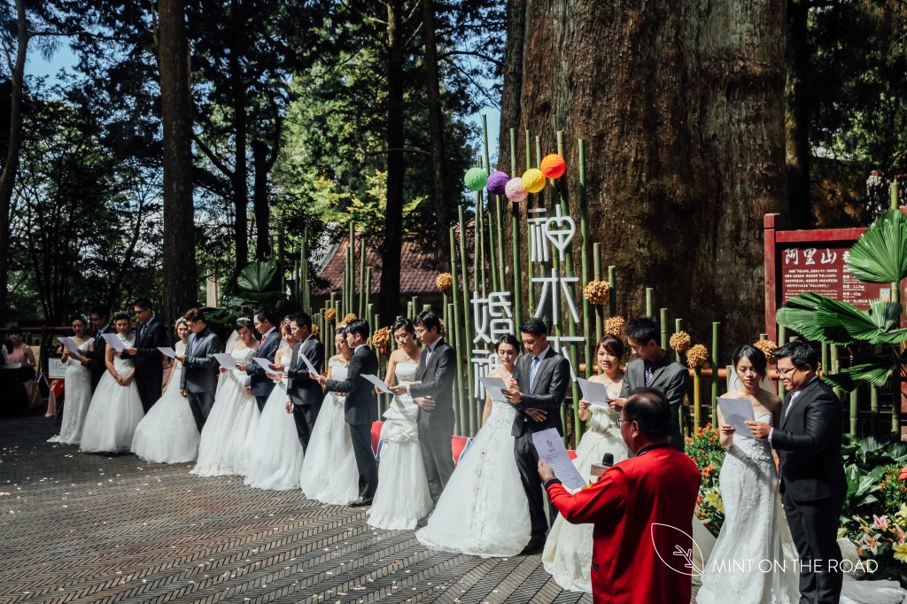 11对新人在小花童的陪伴下步上红毯,走到45米高的香林神木前,由阿里山国家风景区管理处马惠达处长、行政院农业委员会林务局嘉义林区管理处周恒凯秘书和嘉义县文化观光局许有仁局长共同签下爱情证书,祝福他们的爱情跟婚姻幸福美满,就如神木,长长久久,千年不朽。