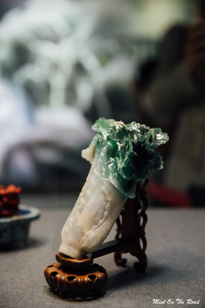 翠玉白菜,不听介绍我根本不会发现叶子上有2只小昆虫,有多子多孙的含义,因此有人推测那是光绪皇帝的妃子瑾妃的嫁妆,祝福她多子多孙。
