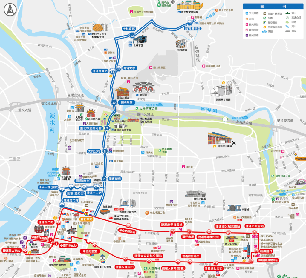 台北市双层观光巴士目前共有8台车,分为红、蓝2条路线,每40分钟一班车绕行台北车站、北门、西门、景福门等旧城区后,蓝线转经中山北路前往故宫,红线则沿信义路前往101再由忠孝东路折返。