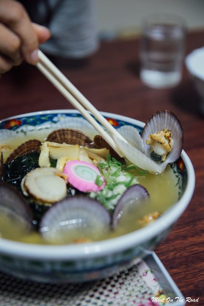 M这还没笑完,老板果真端来了一大碗拉面,我算了一下,里面足足有10只大干贝。[哦哦哦哦哦~]我们忍不住大叫,1000日元有10只大干贝,也太值得了吧?老板笑了笑,指了指干贝说[Ho-ta-te],那是我们那一天学的第一句日文。
