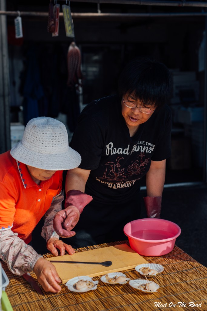 大姐发现我们是外国人后好开心,说完OkOk后手起刀下,不到10秒已经开好4只扇贝,用手怼到我们眼前,眼睛眨呀眨地似乎在问[你们怎么还不吃?],可是,那是生的呀?!!