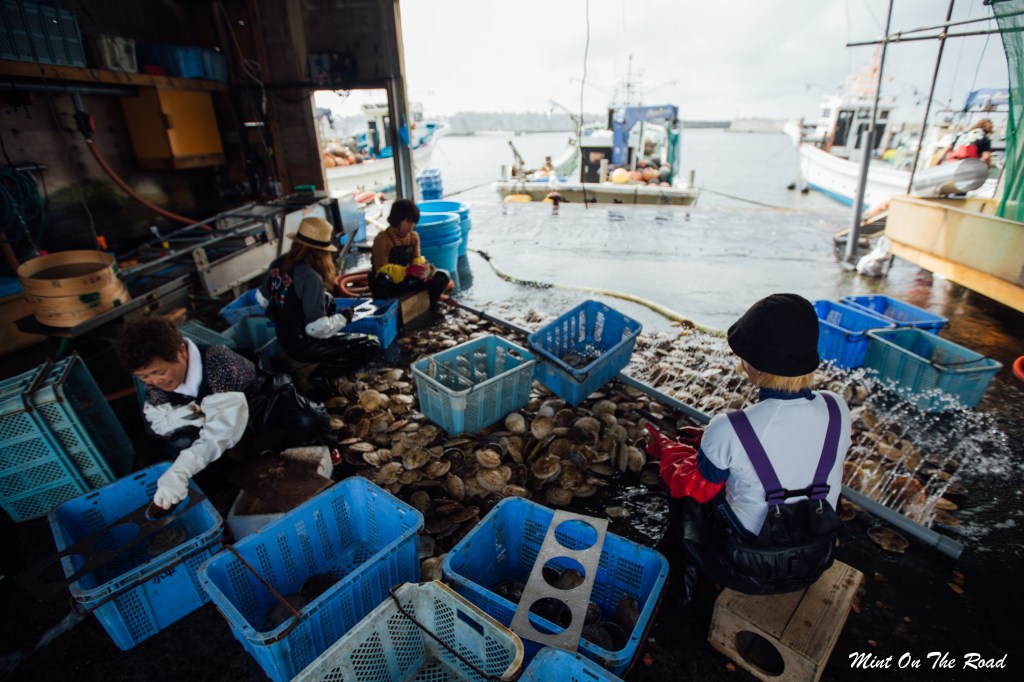走到了渔港去逛一逛,刚巧见识到了当地妇女们依尺寸在分扇贝的工作实况。