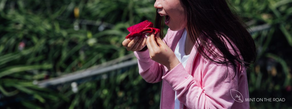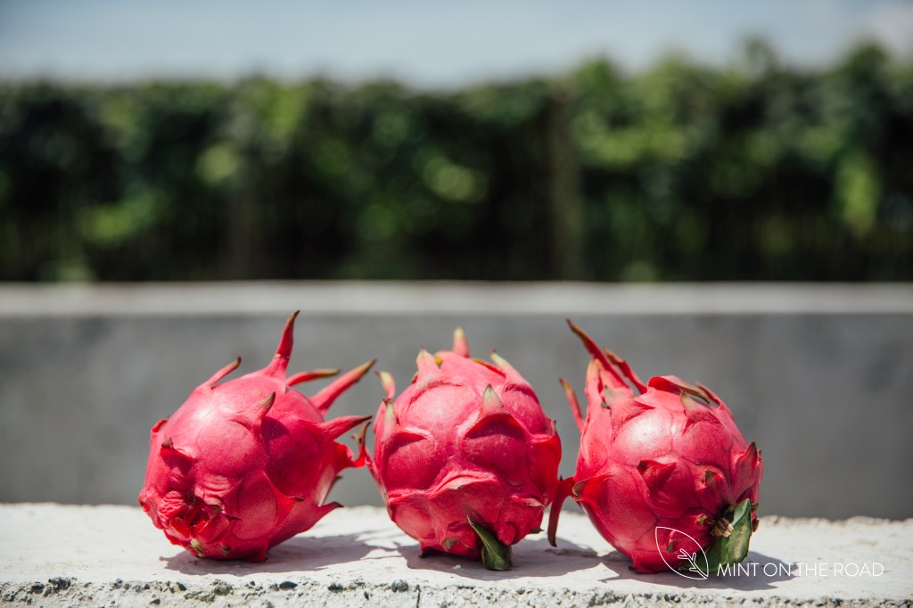 在艳阳下抵达,新科火龙果园的园主一见我们立刻端出一大盘可用[堆积如山]来形容的火龙果让我们品尝。那一刹那,我们全身的神经全集中在舌尖,在细细地品尝,细细地享受那又香又甜又多汁的火龙果,完全忘记之前所有的舟车劳顿。