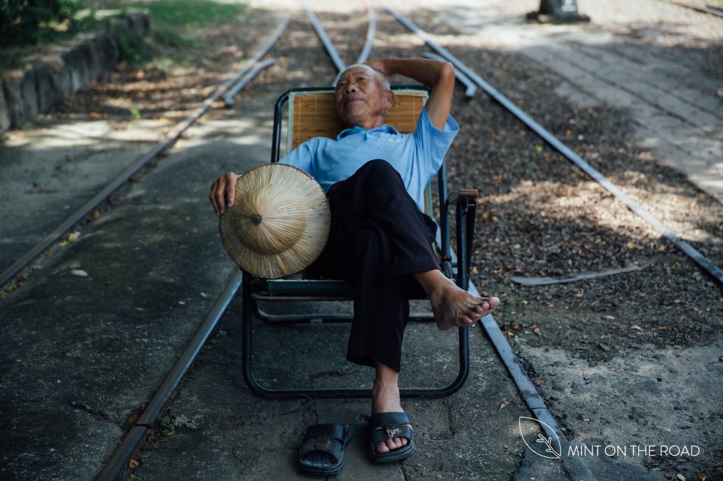 老爷爷走进宿舍里,拿出了一本书和一张躺椅迈步往铁轨的方向走去。我蹑手蹑脚地跟他在身后,想趁其不意,拍下他的午后时光,没想到一下让爷爷给识破诡计。用破福建话问爷爷能不能拍他,他这一刻还在挥手笑说[我又不好看],下一刻已经把斗笠给盖在脸上开始打呼。按下快门的那一刻,我似乎在取景器里看到了公公在世时在祖屋外的躺椅上睡午觉的模样。