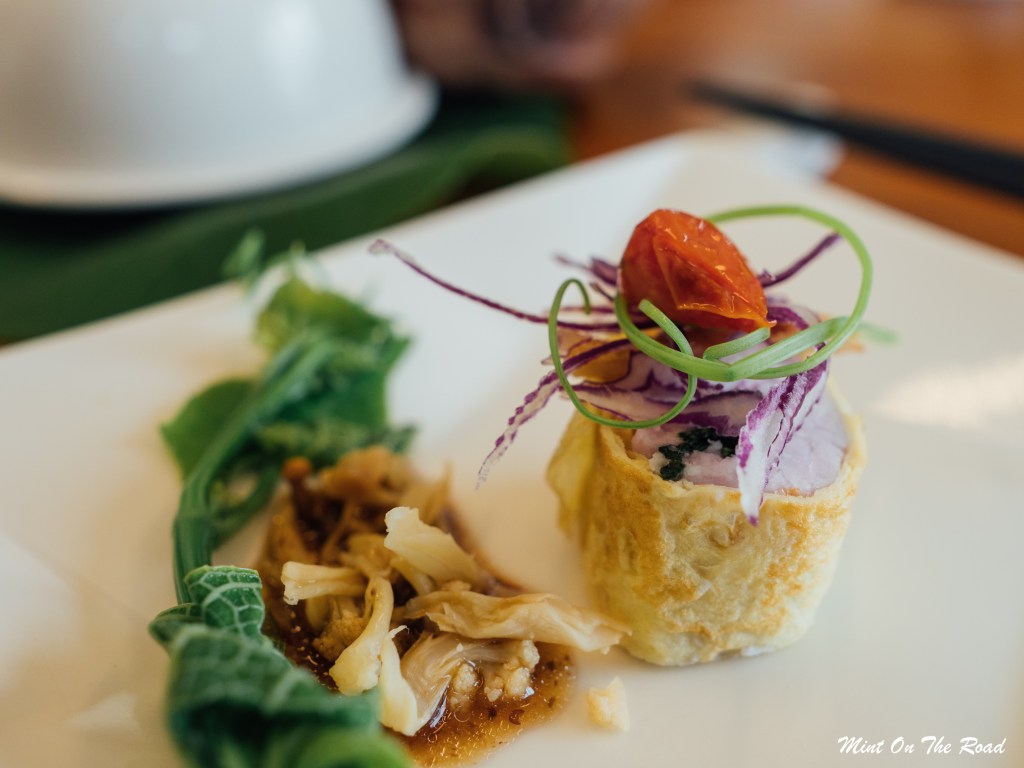 下一道(由右到左)是由清脆的野菜竹笋、酸甜的洛神花和越咬越香的干贝山蔬所组成的[山之味]。其实…服务生每一次端上一道料理,都会介绍食材和做法,可美食当前呀,我是真的无法专心去听去追究料理名称究竟是[山之味]还是[三之味],所以若有错的话,纠正我,别较真OK~