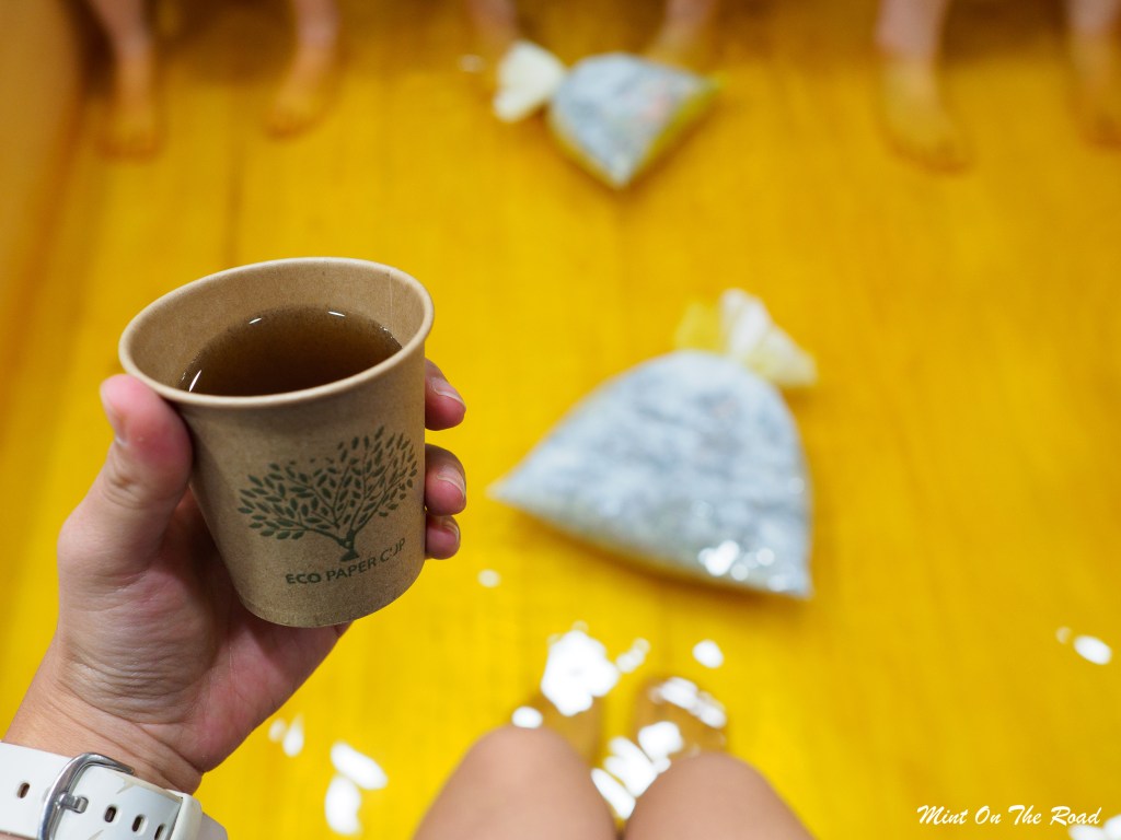 连逛了3天的我们,一抵达就迫不及待去体验了韩式足浴。只放到脚踝高度的热水里散发出浓浓的草药味,喝一杯热茶,泡20分钟,原本已想罢工的铁腿一下又满血复活了。