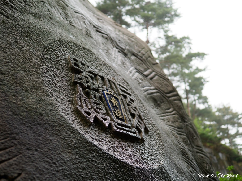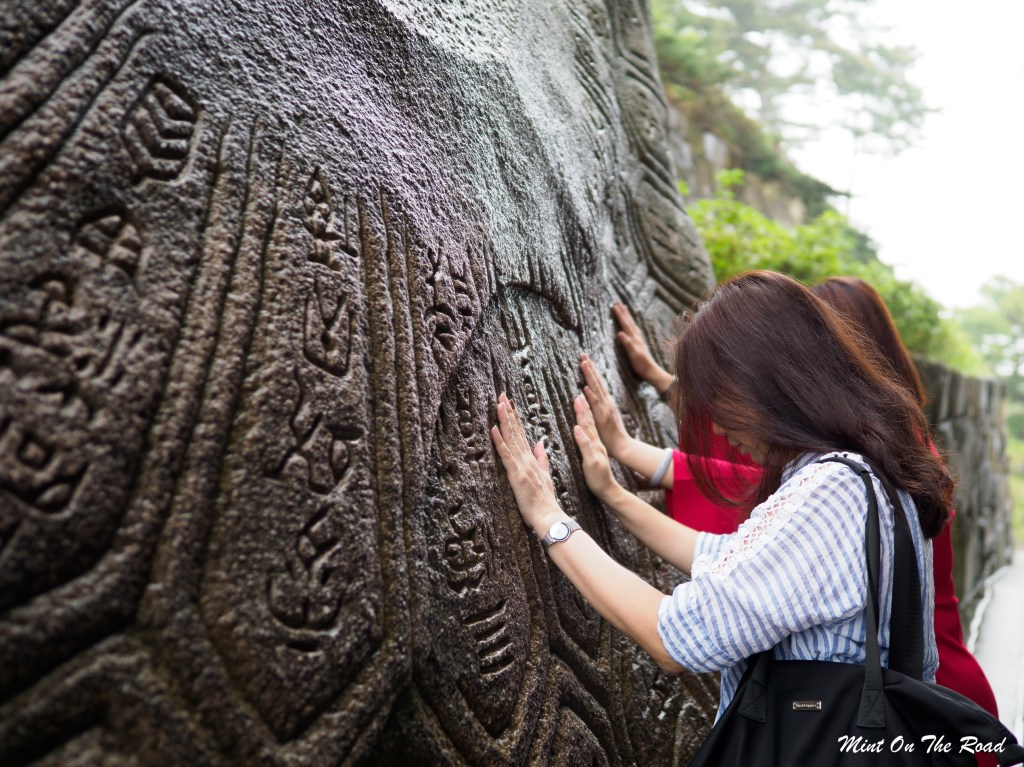 清晨在跟导览员去[气]体验场去体验传说中的[龟鉴石]。重达127吨的大石头上刻着世界上所有的喜事,听说把手或身体靠向石头即可吸取石头上的好气息。我也抱了抱石头,至于会不会有好运,就看下一期的彩票咯。