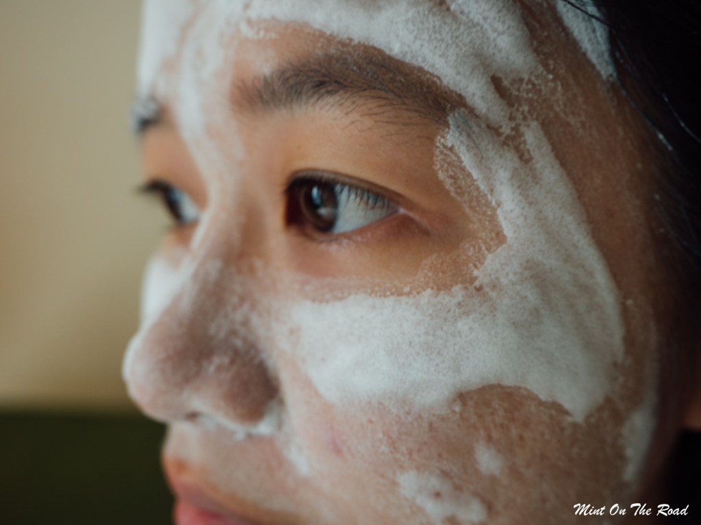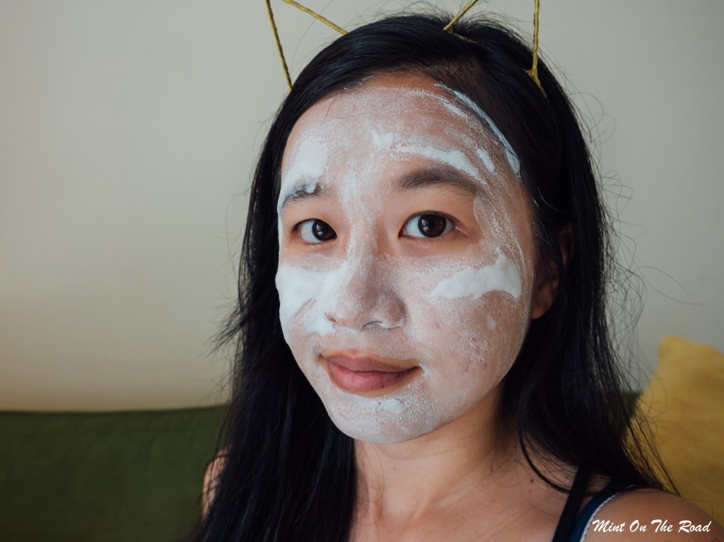 洗完脸后,在依旧有点湿润的脸上轻轻抹上一层带有浓浓奶香味的Milk Peel Cream Mask,再用手慢慢推匀。原本霜状的面膜会慢慢变成泡沫状,耳边会传来细细的[嘶嘶嘶嘶]的泡泡的声音,特别特别疗愈。最后静待30至60秒,再用水把脸冲干净即完成。
