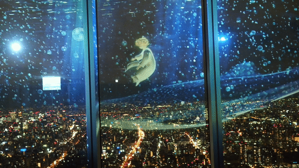 回到空中走廊,天色已暗,大阪的城市华灯初上。6点半音乐准时响起,大阪的城市夜景一下变成了背景,空中出现骑着鲸鱼的小王子,自由自在地在空中飞翔,视觉效果💯好吧,我中文不好,真不知该怎么形容,送你一个GIF好了,欢迎无限Replay。