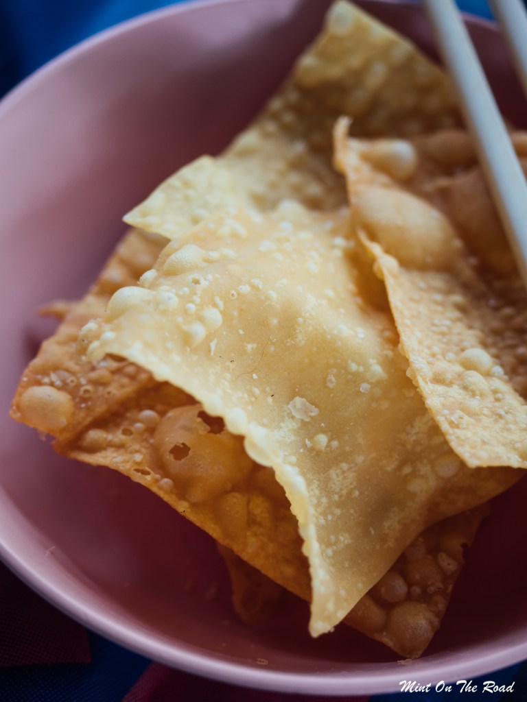 Pad Thai Song-Kreung上铺满了一丝丝的芒果丝、蟹肉丝和鱿鱼丝。搅合好尝一口,芒果的清甜、蟹肉的鲜味和鱿鱼丝的浓郁在舌尖上如海浪似一波一波地冲来,味道很有层次和惊喜,推荐给所有的Pad Thai迷们。哦对,切记它是2人份的,别再犯我们点太多的错啦。
