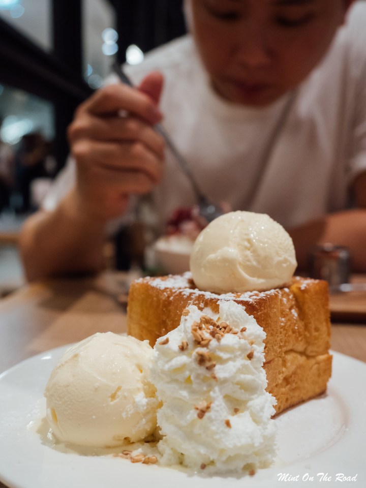 心想难得来曼谷,M又加点了一道传说中After You的镇店之宝—Shibuya Honey Toast。热烘烘,皮一咬下会有轻轻的[卡兹]声响的吐司里面软绵绵的,才一口,浓郁的奶油香气已从舌尖开始蔓延,慢慢地把我们困在另一个幸福的陷阱里。