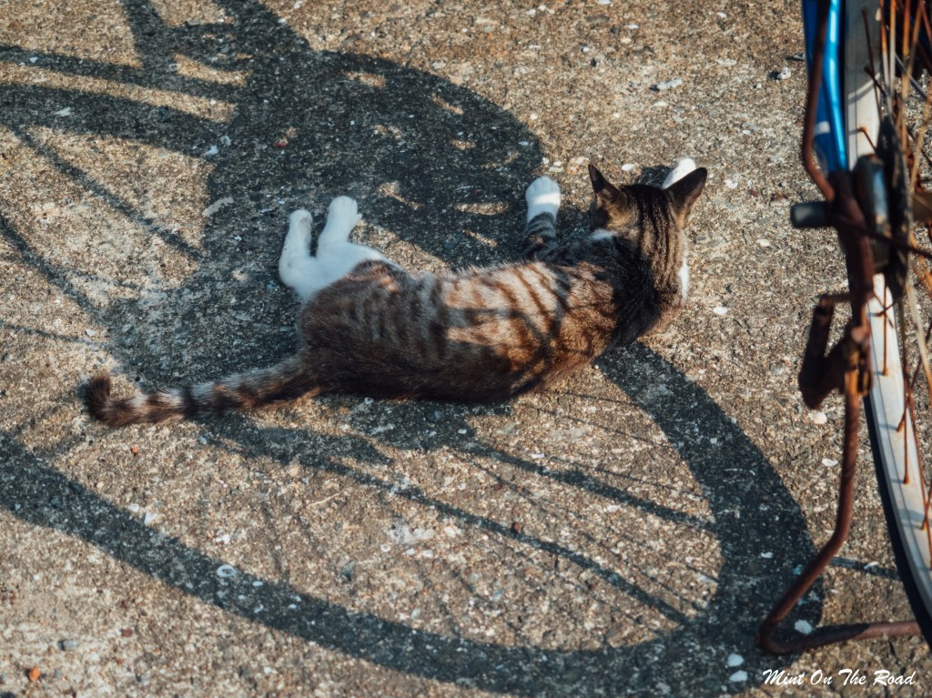 不用找,走出码头,眼前立刻出现三三两两地躺在海边晒太阳的猫咪。
