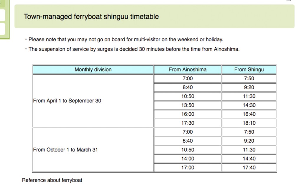 # Ferry班次有限,建议出发前先到新宫町网站确定发船时刻。
