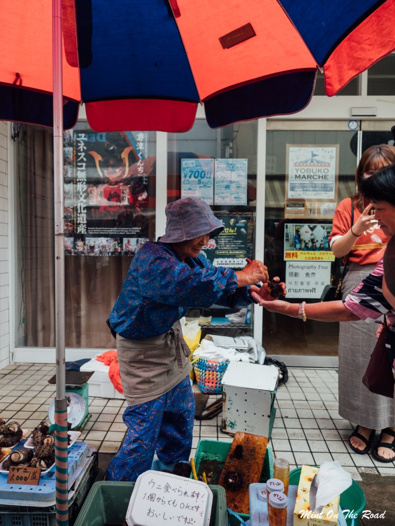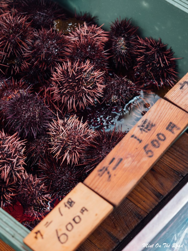 我没把OS说出口,只是跟M对望了一眼,原本因为价钱而止步的我们又再次走到队伍的最尾端。最后吃了3只海胆,老奶奶见我们笑得见牙不见眼的,说了一堆日文,只收我们500Yen,那就是我喜欢小镇的原因呀,人特别特别热情。
