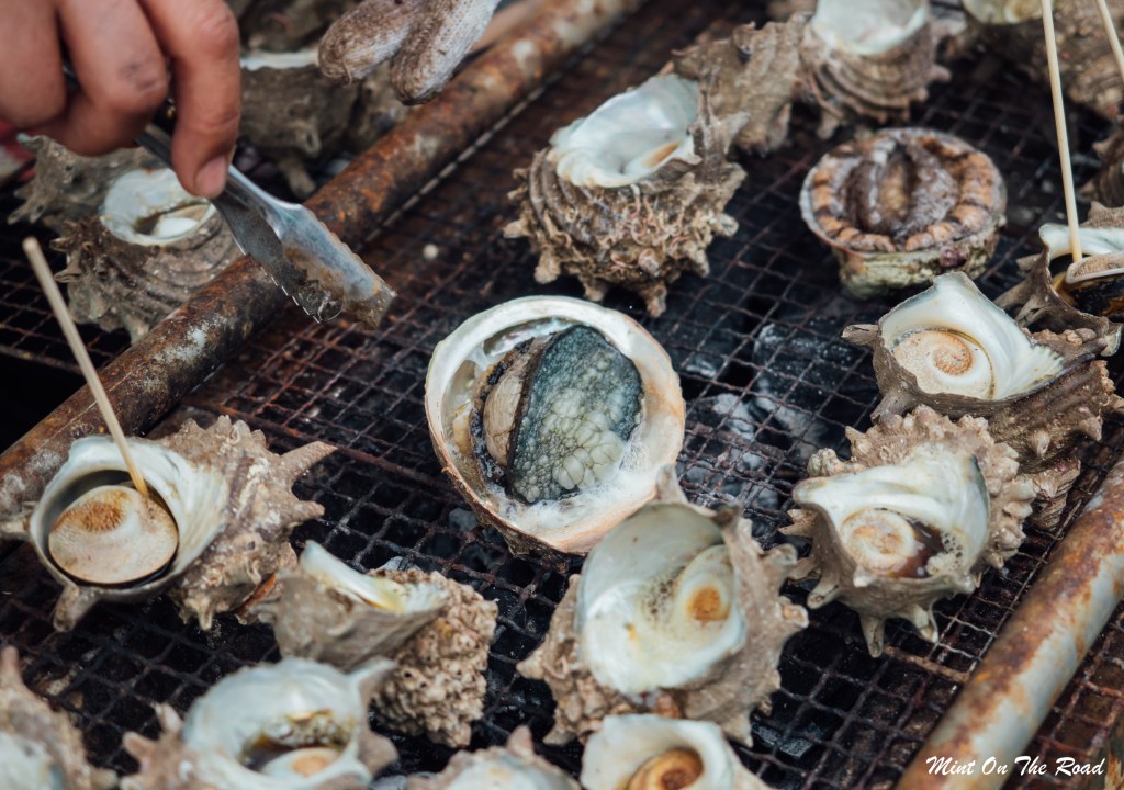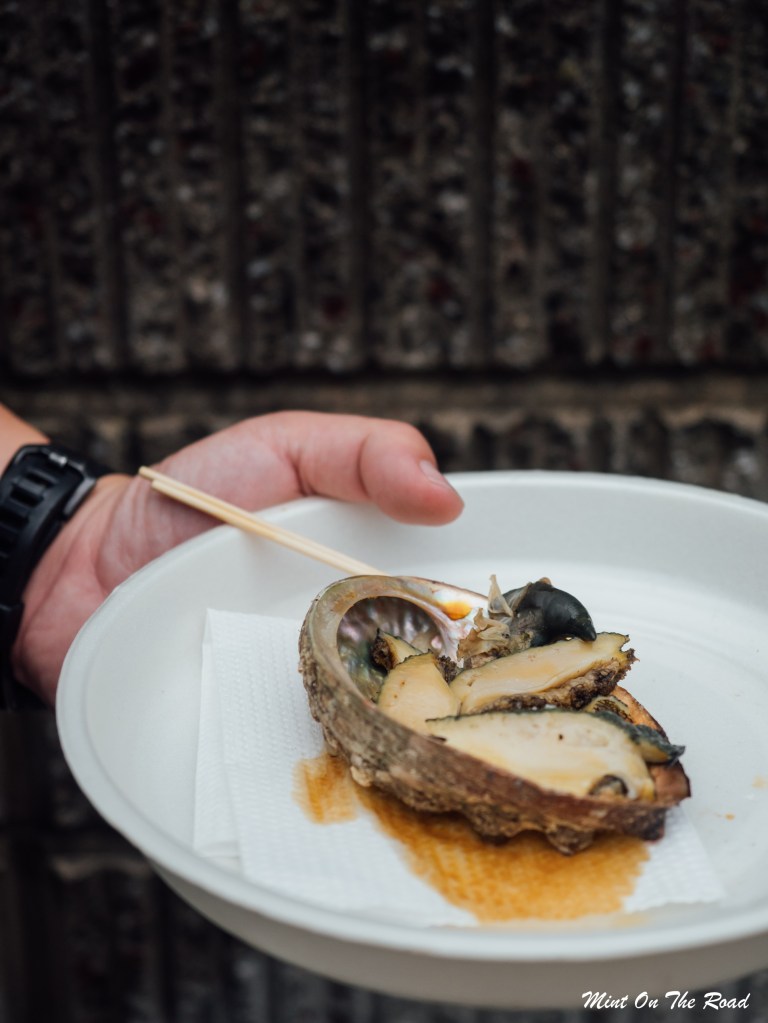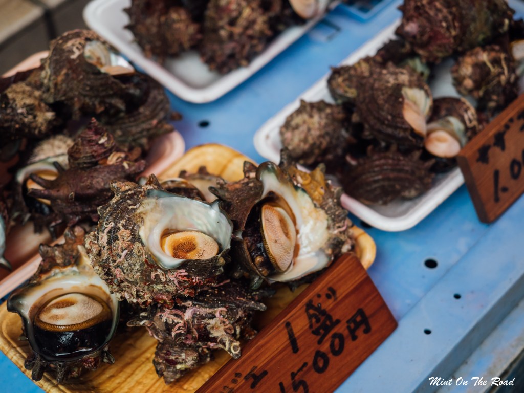 后来我们又试了烤海螺和烤鲍鱼,是鲜美,可论惊艳,依旧是海胆最无敌。哦对,建议挑有标明价钱的摊位,因为我跟M乱点完才知道鲍鱼一只要1500Yen,所以我们的鲍鱼是在坑里啃的,美味有限呀(哭笑不得)。