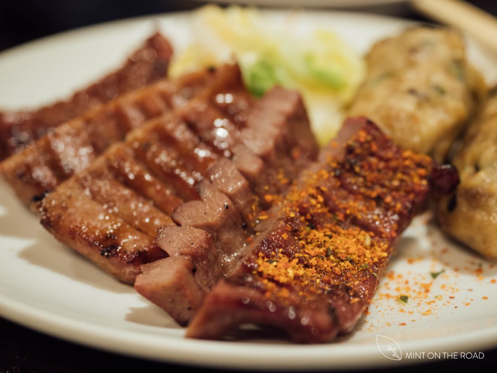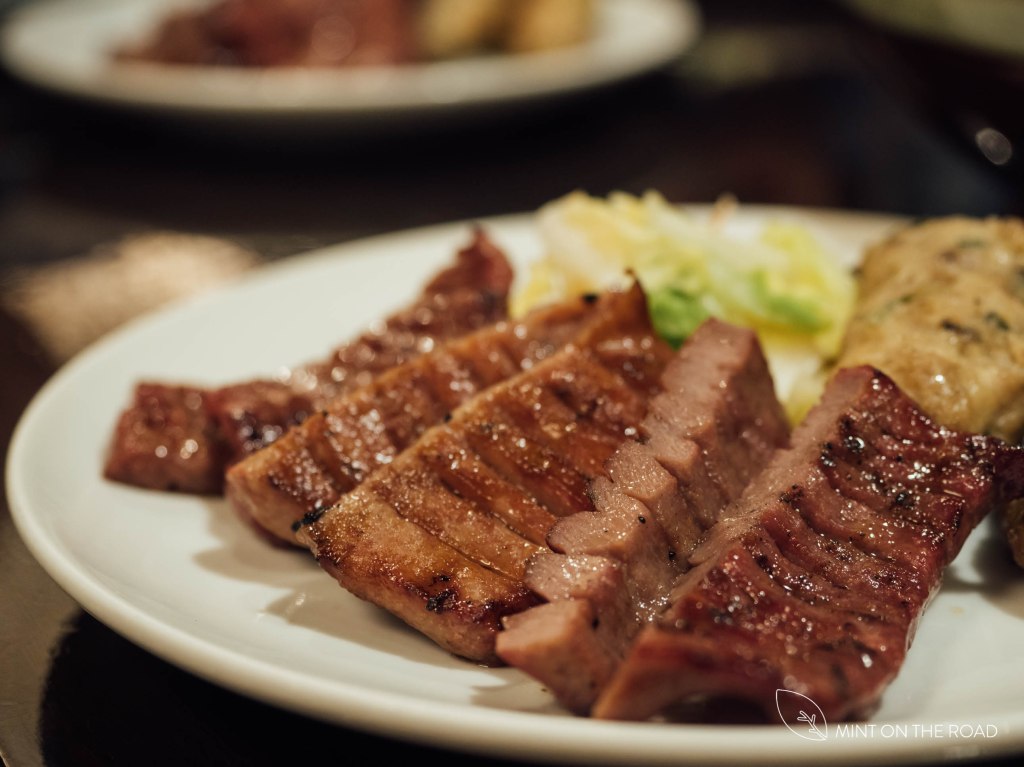 食物上桌,我所点的牛舌定食里,有一份切成2公分厚,烤得油亮油亮的牛舌,看得我食指大动,跟电影里所见的相差了十万八千里。一口咬下,不腥,而且很Q弹,学当地的朋友们洒上一点点的七味粉,再尝,又是另一番风味。