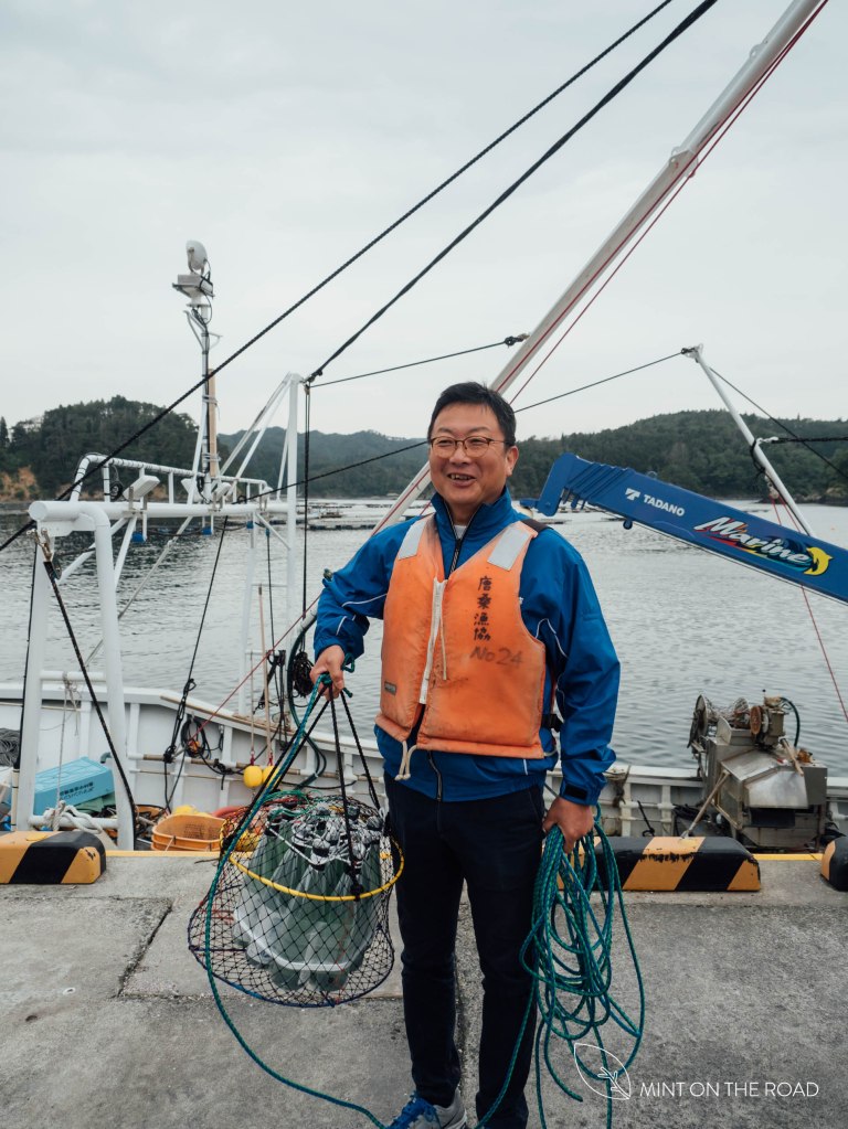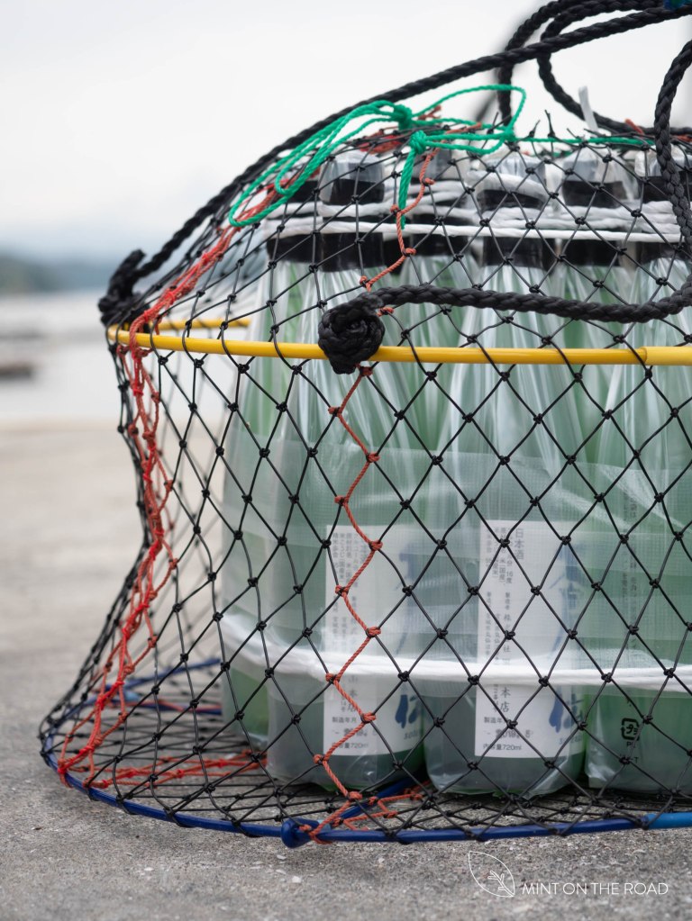 Kashiwa San说因为酿好的酒,最好保存在温度稳定的地方,以前他们会把酒存在山洞里,但8年前发现,把酒存放进海里,不但温度稳定,而且一波波的海浪会让酒的味道变得更多层次。因为位子有限,他们每年只开放保存100瓶酒。我们到牡蛎养殖场的任务,就是把我们所买的12瓶得奖的[蒼天伝]清酒存放进海里。