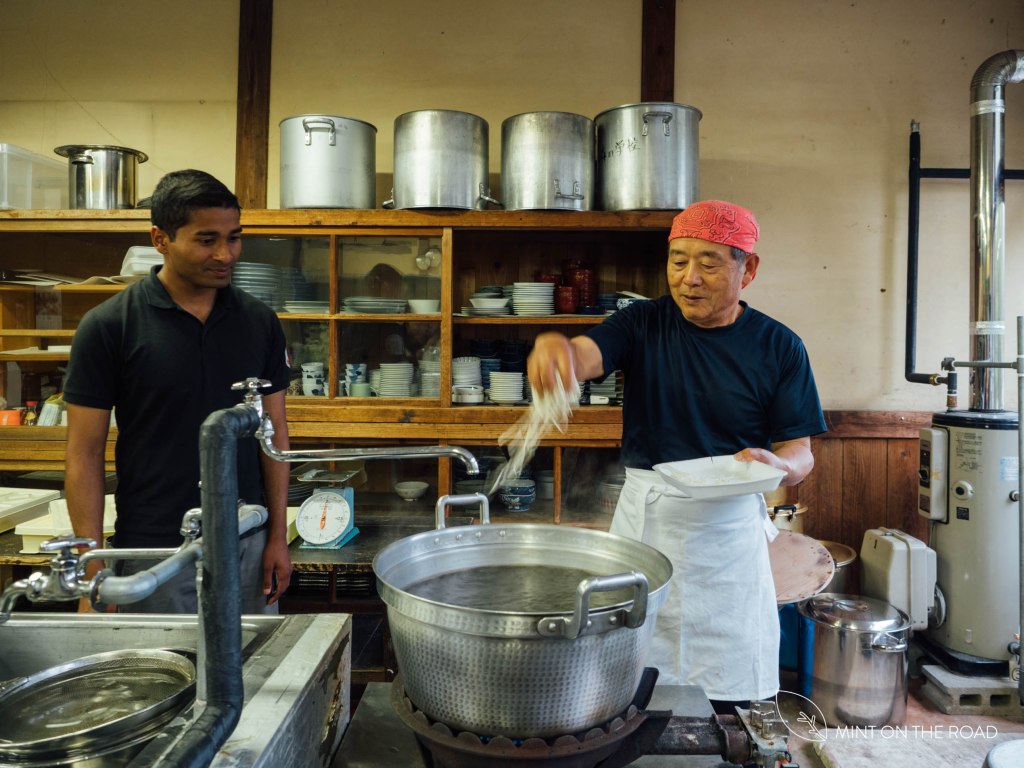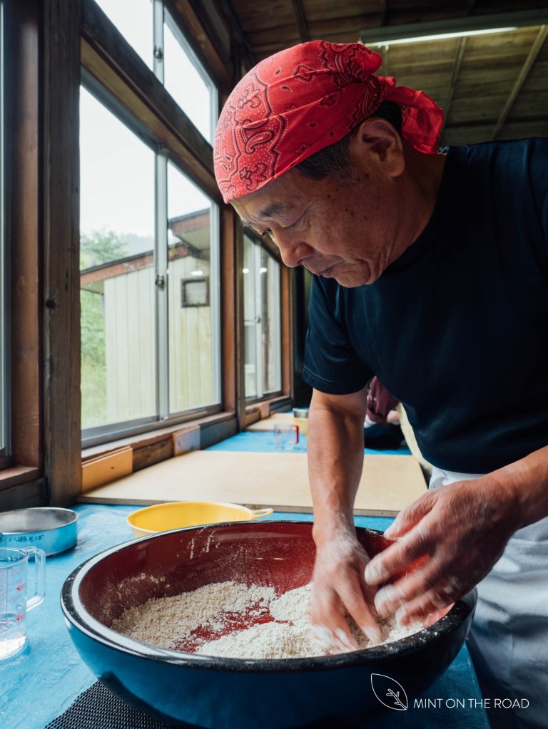 跟着他的指示,我们一步一步慢慢地从搓面团、擀面到最后把面切成荞麦面,老爷爷都很有耐性地在指导,但是,别看他笑笑的,对食物和食材是很认真的。记得当时另一组的旅伴想说好玩,就在等待时,在面团上画了一个笑脸,结果爷爷看到立刻冲过来说[Nononono],一把把笑脸拍扁,把面团搓回原本完美的圆。