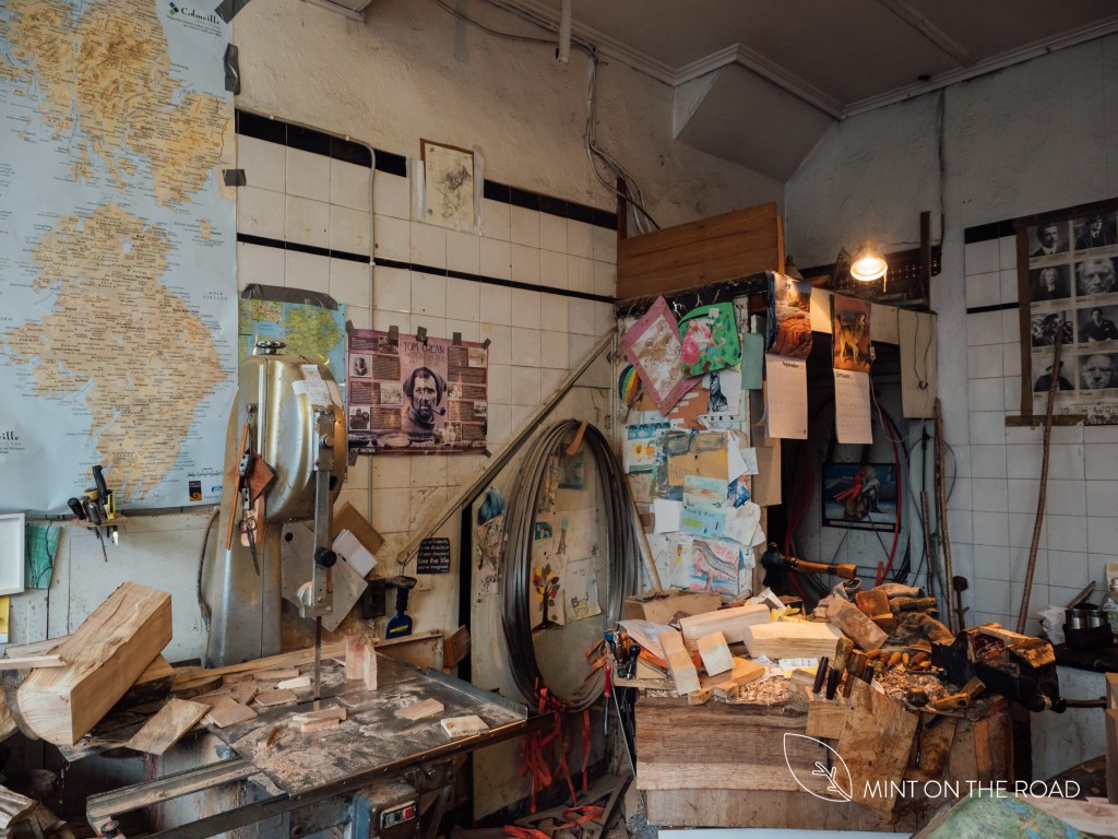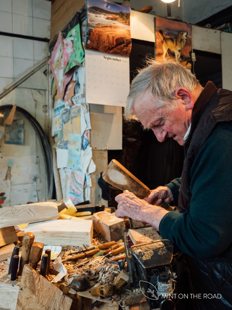 原来这间店是他爸爸以前经营的肉铺,所以店里至今依旧保留很多宰杀牛羊所用的电锯、砧板等等工具。老爷爷自小就喜欢木雕。可当时斯莱戈只有石雕,并没有木雕的传统,毕竟当地也没有生产好的木材。「我特别不明白,传统不也是以前以前的古人创造的吗,没有传统,我就自己创造传统吧。」反正他爸爸不反对,他就早上帮忙经营肉铺,下午研究木雕。直到后来爸爸去世,他才把店改成工作坊,全职投身木雕事业。