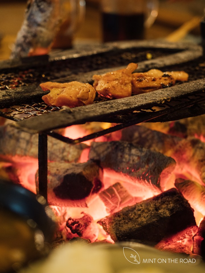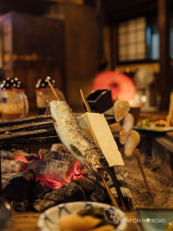 老太太再次出现时,手上拿了一铲子的炭和一个铁架,一下就在我们跟前的囲炉里设好炉火。端出食材,她仔细地帮我们把早已串好的川鱼、豆腐、山芋串牢牢地扎在铁架旁,意示我们把它们留到最后,让它们慢慢慢慢熏烤。